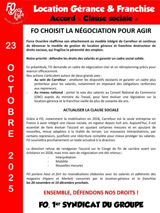 Force Ouvrière réaffirme son attachement au modèle intégré de Carrefour et continue de dénoncer le modèle de gestion de location gérance et franchise destructeur de droits sociaux, qui fragilise la pérennité des emplois.