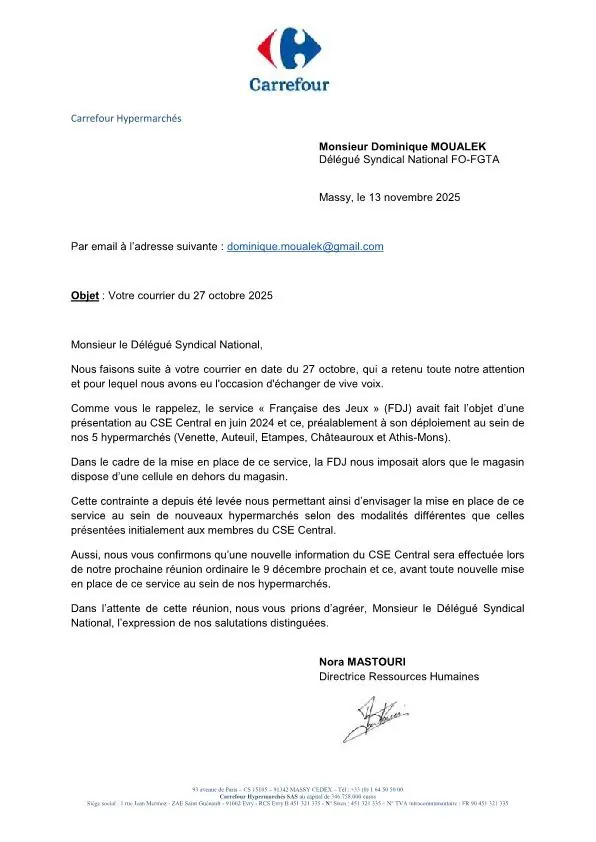 Courrier du 27 octobre 2025, adressé à Nora Mastouri, directrice des ressources humaines de Carrefour Hypermarchés.
