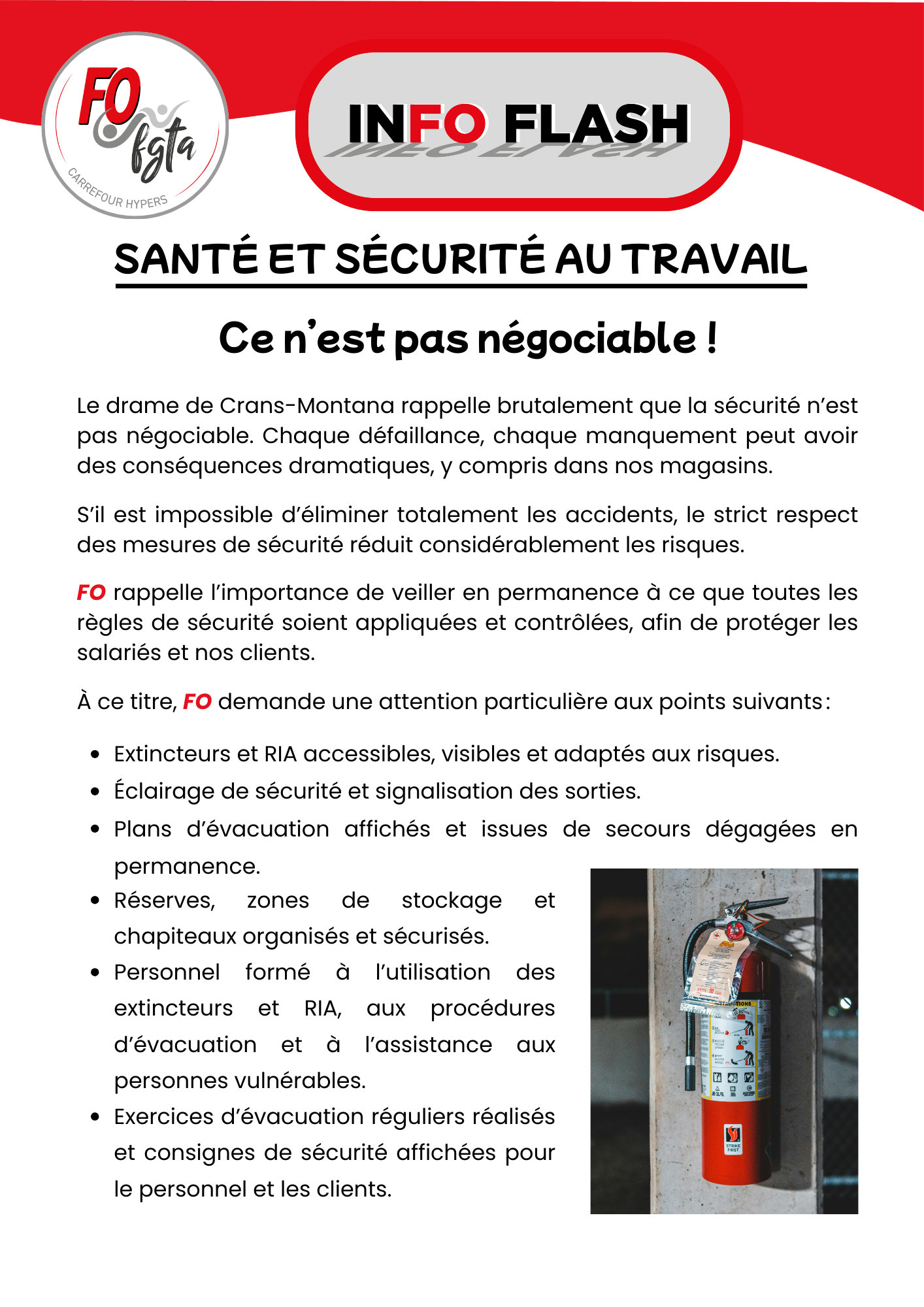 FO rappelle l’importance de veiller en permanence à ce que toutes les règles de sécurité soient appliquées et contrôlées, afin de protéger les salariés et nos clients.